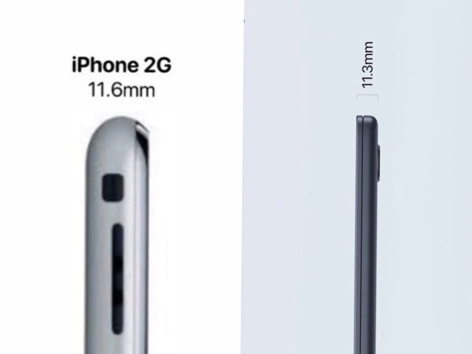 Em 2007, baterias de íon-lítio ainda eram volumosas, e incluir uma câmera de 2 megapixels e conectividade EDGE exigia espaço. Apesar disso, o iPhone foi elogiado por sua construção em alumínio e vidro, que o tornava mais fino que muitos concorrentes da época, como o BlackBerry Pearl (14,5 mm) ou o Nokia N95 (21 mm).